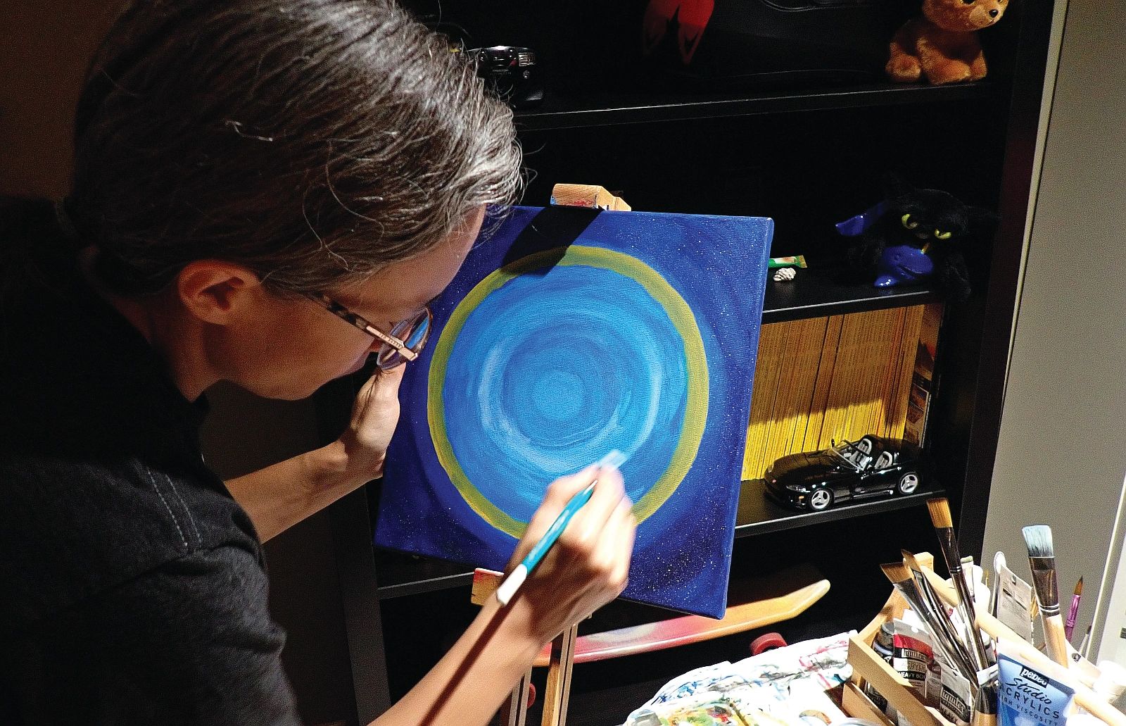 Donna uses bold and striking primary colours. She conveys moods by manipulating subject matter (eagles are her favourite) and lighting. One piece depicted an eagle with coloured lines coming out of its wings, inspired by Indigenous fancy dance outfits used during powwows. Such culturally significant art is difficult to present. In the future, Donna wants to try to incorporate more Ojibwe themes and their meaning into her artwork. Her art will always be an expression of nature that encourages people to appreciate it and take care of it. I have limited knowledge of Ojibwe culture but seeing how Donna promotes it in her art has exposed me to this community and encouraged me to learn more about its people.
